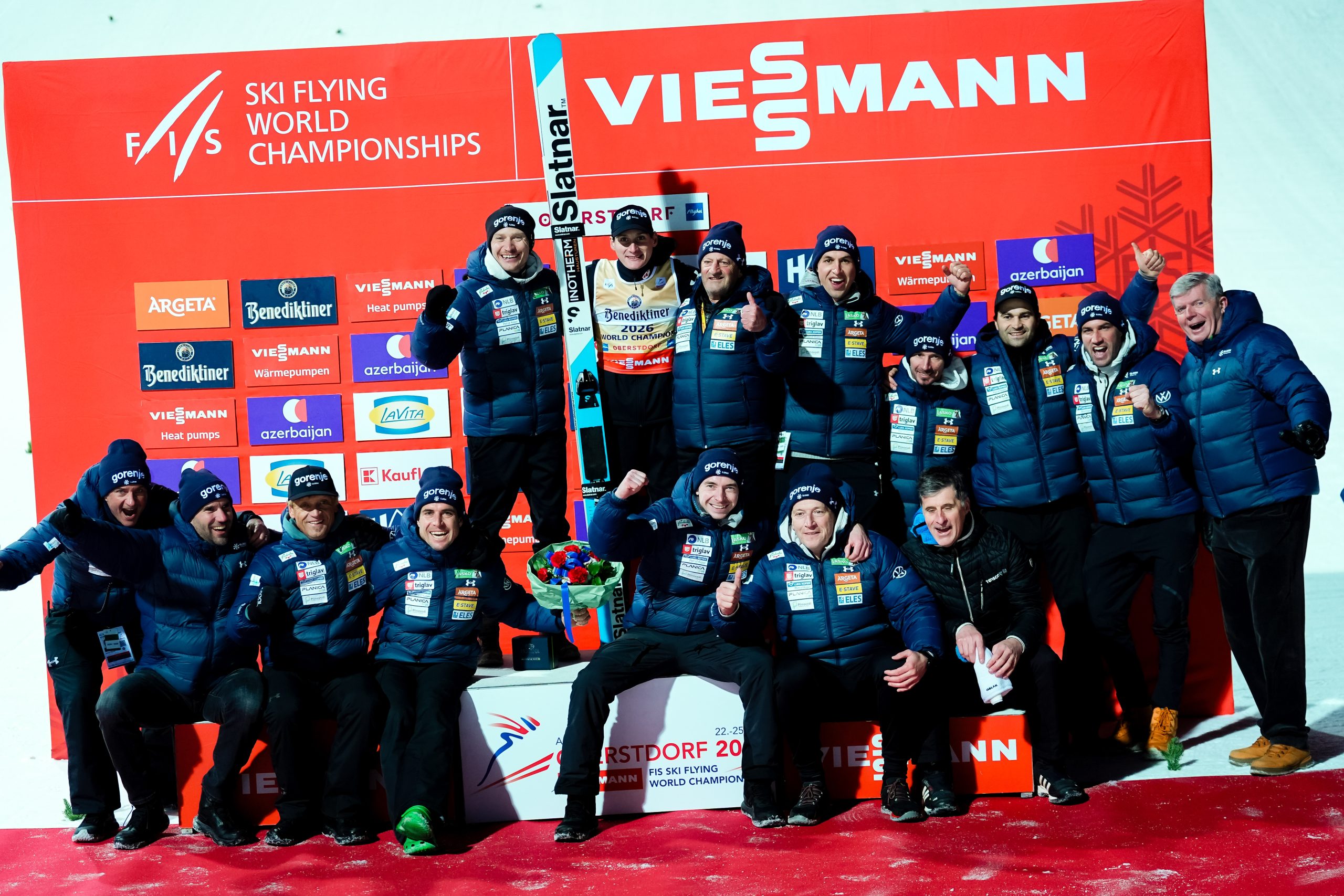 Domen Prevc s člani reprezentance na zmagovalnem odru po osvojitvi naslova svetovnega prvaka. Foto: Nordic Focus